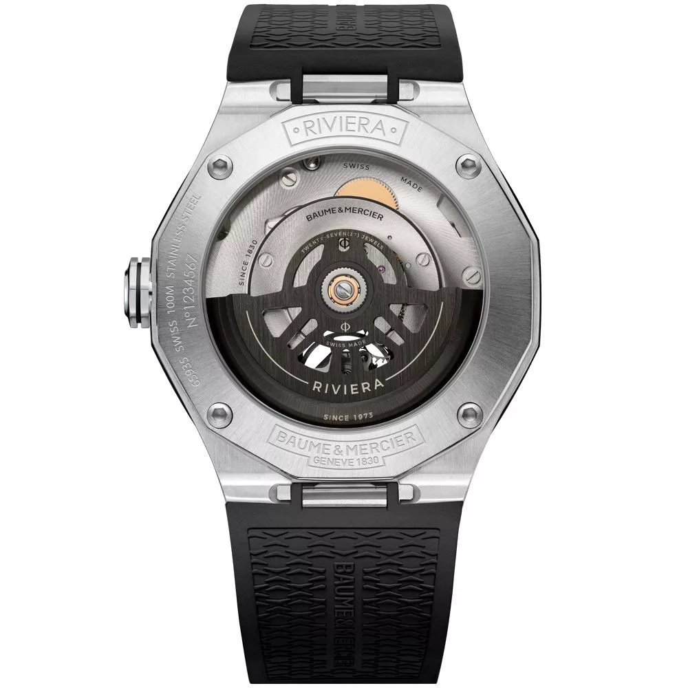 El material de la caja del reloj Baume & Mercier Riviera reloj de hombre M0A10721 es acero inoxidable, su color es plata, el material de la correa es silicio y su color es negro. El diámetro de la caja del reloj es 42 mm, su forma es rueda. El cristal del reloj es zafiro (sin rayones), su mecanismo es automático y su resistencia al agua es 10 atm (100 m) (apto para nadar).