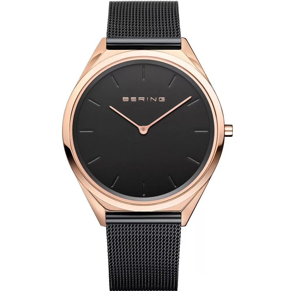 El material de la caja del reloj Bering Ultra Slim unisex mirar 17039-166 es acero inoxidable, su color es oro rosa, el material de la correa es acero inoxidable y su color es negro. El diámetro de la caja del reloj es 39 mm, su forma es rueda. El cristal del reloj es zafiro (sin rayones), su mecanismo es cuarzo y su resistencia al agua es 3 atm (30 m) (sin goteo).