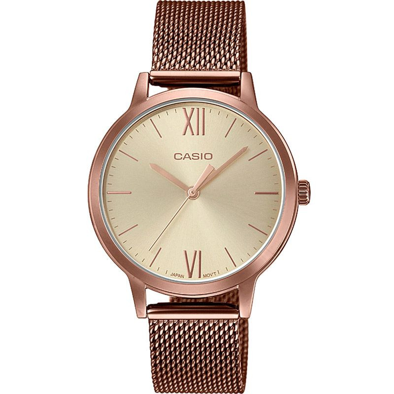 El material de la caja del reloj Casio Classic reloj de mujer LTP-E157MR-9AEF es acero inoxidable, su color es oro rosa, el material de la correa es acero inoxidable y su color es oro rosa. El diámetro de la caja del reloj es 32 mm, su forma es rueda. El cristal del reloj es cristal (difícil de rayar), su mecanismo es cuarzo y su resistencia al agua es 3 atm (30 m) (sin goteo).