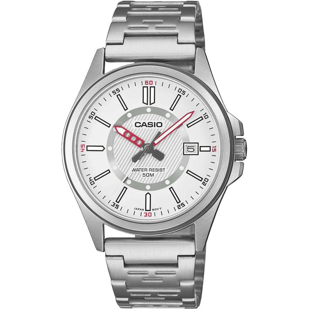 El material de la caja del reloj Casio Collection reloj de hombre MTP-E700D-7EVEF es acero inoxidable, su color es plata, el material de la correa es acero inoxidable y su color es plata. El diámetro de la caja del reloj es 40 mm, su forma es rueda. El cristal del reloj es cristal (difícil de rayar), su mecanismo es cuarzo y su resistencia al agua es 5 atm (50 m) (altamente resistente a caídas).