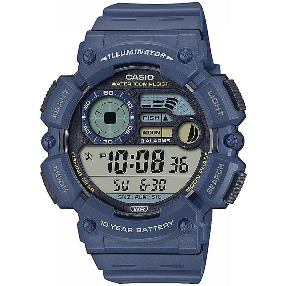 El material de la caja del reloj Casio Collection reloj de hombre WS-1500H-2AVEF es el plastico, su color es azul, el material de la correa es el plastico y su color es azul. El diámetro de la caja del reloj es 50 mm, su forma es rueda. El cristal del reloj es plexiglás (plástico), su mecanismo es cuarzo y su resistencia al agua es 10 atm (100 m) (apto para nadar).
