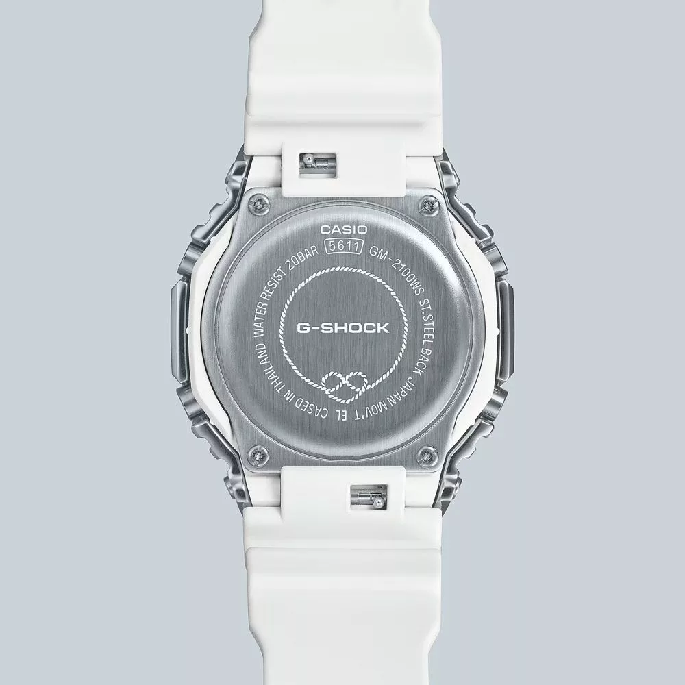 El material de la caja del reloj Casio G-Shock Seasonal Collection reloj de hombre GM-2100WS-7AER es acero inoxidable, su color es plata, el material de la correa es el plastico y su color es blanco. El diámetro de la caja del reloj es 44 mm, su forma es rueda. El cristal del reloj es cristal (difícil de rayar), su mecanismo es cuarzo y su resistencia al agua es 20 atm (200 m) (apto para buceo).