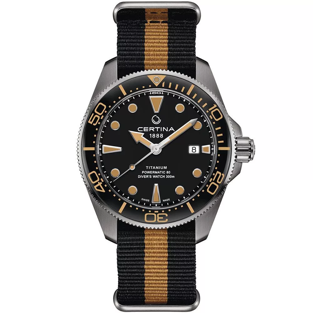El material de la caja del reloj Certina DS Action Diver reloj de hombre C032.607.48.051.00 es titanio, su color es gris, el material de la correa es tela y su color es Barna,Fekete. El diámetro de la caja del reloj es 43 mm, su forma es rueda. El cristal del reloj es zafiro (sin rayones), su mecanismo es automático y su resistencia al agua es 30 atm (300 m) (apto para buceo).