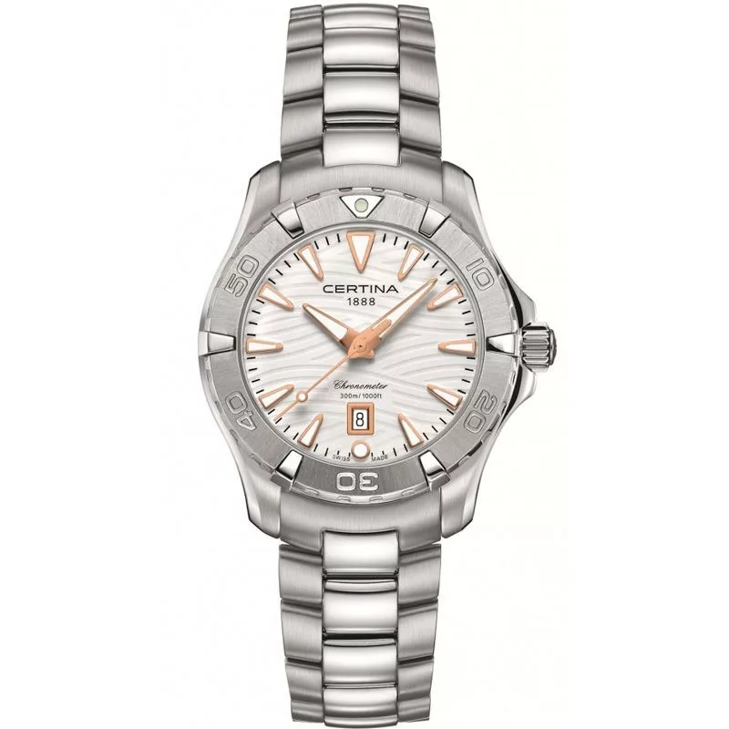 El material de la caja del reloj Certina DS Action reloj de mujer C032.251.11.011.01 es acero inoxidable, su color es plata, el material de la correa es acero inoxidable y su color es plata. El diámetro de la caja del reloj es 34 mm, su forma es rueda. El cristal del reloj es zafiro (sin rayones), su mecanismo es cuarzo y su resistencia al agua es 30 atm (300 m) (apto para buceo).