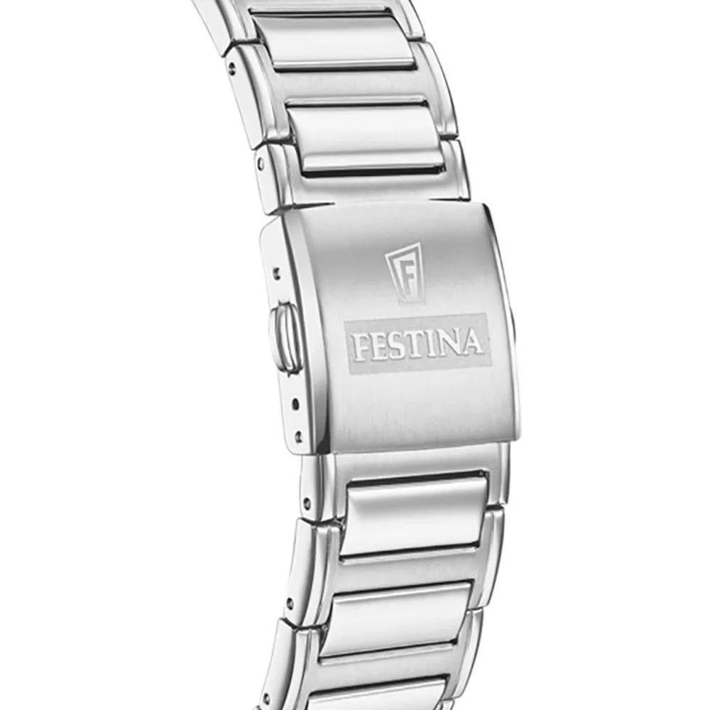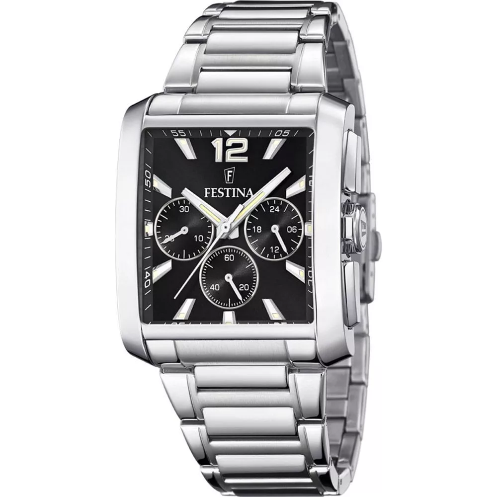 El material de la caja del reloj Festina Timeless Chrono reloj de hombre F20635/4 es acero inoxidable, su color es plata, el material de la correa es acero inoxidable y su color es plata. El diámetro de la caja del reloj es 41 mm, su forma es cuadrado. El cristal del reloj es cristal (difícil de rayar), su mecanismo es cuarzo y su resistencia al agua es 5 atm (50 m) (altamente resistente a caídas).