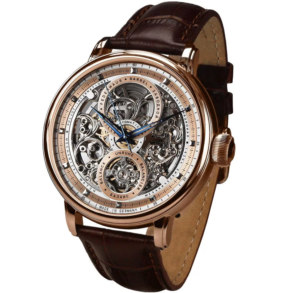 El material de la caja del reloj Poljot International Hermitage reloj de hombre 7500.1940613 es acero inoxidable, su color es oro rosa, el material de la correa es cuero y su color es marrón. El diámetro de la caja del reloj es 43 mm, su forma es rueda. El cristal del reloj es zafiro (sin rayones), su mecanismo es cuerda manual mecánica y su resistencia al agua es 5 atm (50 m) (altamente resistente a caídas).