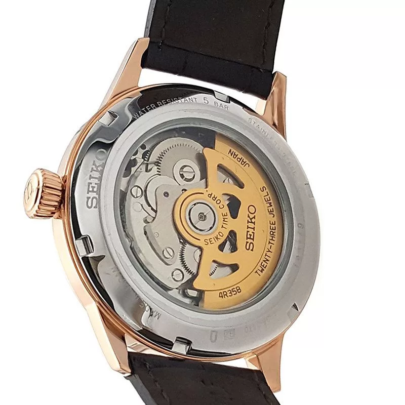 El material de la caja del reloj Seiko Presage reloj de hombre SRPB46J1 es acero inoxidable, su color es oro rosa, el material de la correa es cuero y su color es marrón. El diámetro de la caja del reloj es 41 mm, su forma es rueda. El cristal del reloj es cristal (difícil de rayar), su mecanismo es automático y su resistencia al agua es 5 atm (50 m) (altamente resistente a caídas).