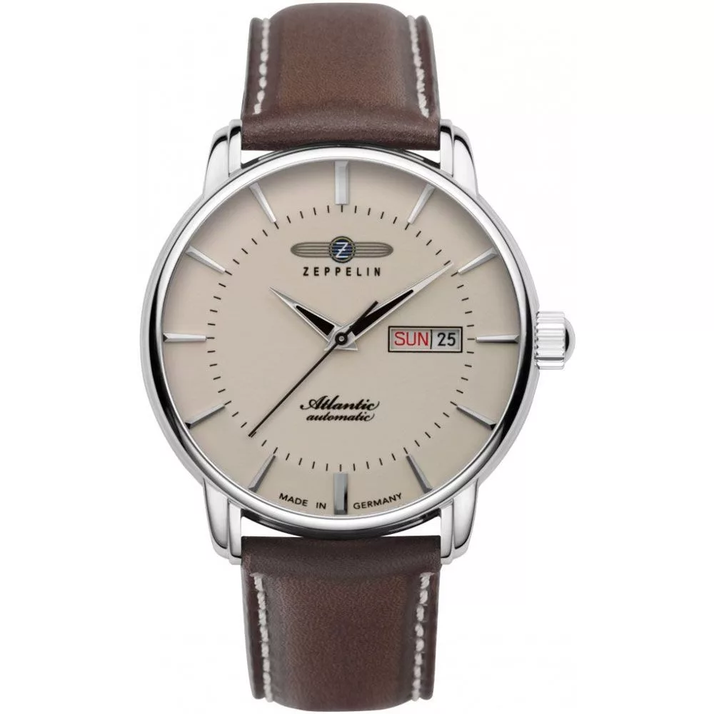 El material de la caja del reloj Zeppelin Atlantic reloj de hombre 8466-5 es acero inoxidable, su color es plata, el material de la correa es cuero y su color es marrón. El diámetro de la caja del reloj es 40 mm, su forma es rueda. El cristal del reloj es cristal (difícil de rayar), su mecanismo es automático y su resistencia al agua es 5 atm (50 m) (altamente resistente a caídas).