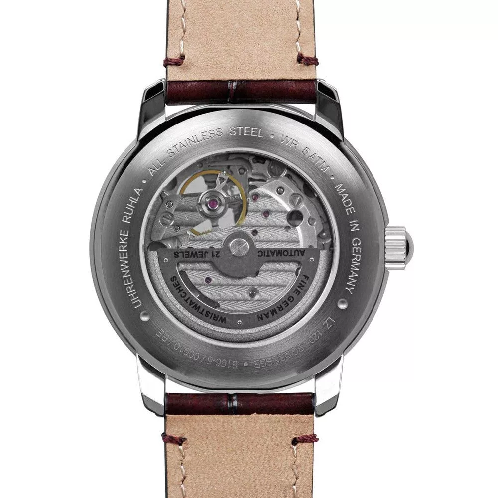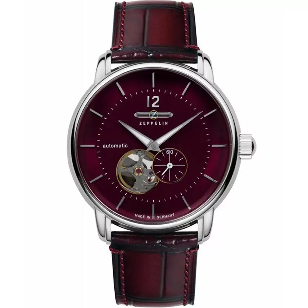 El material de la caja del reloj Zeppelin LZ120 Bodensee reloj de hombre 8166-5 es acero inoxidable, su color es plata, el material de la correa es cuero y su color es borgoña. El diámetro de la caja del reloj es 40 mm, su forma es rueda. El cristal del reloj es cristal (difícil de rayar), su mecanismo es automático y su resistencia al agua es 5 atm (50 m) (altamente resistente a caídas).